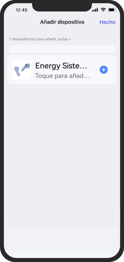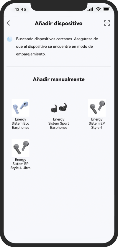 Abre la carcasa de los auriculares. En la pantalla de inicio presiona el botón "Añadir" y realizara la búsqueda automática. Cuando aparezca tus Senshi Eco Earphones presiona el botón Añadir, realizara la descarga del menú del modelo (Earphones Style 4) y cuando finalice la descarga del interface del modelo pulsa al botón Hecho,